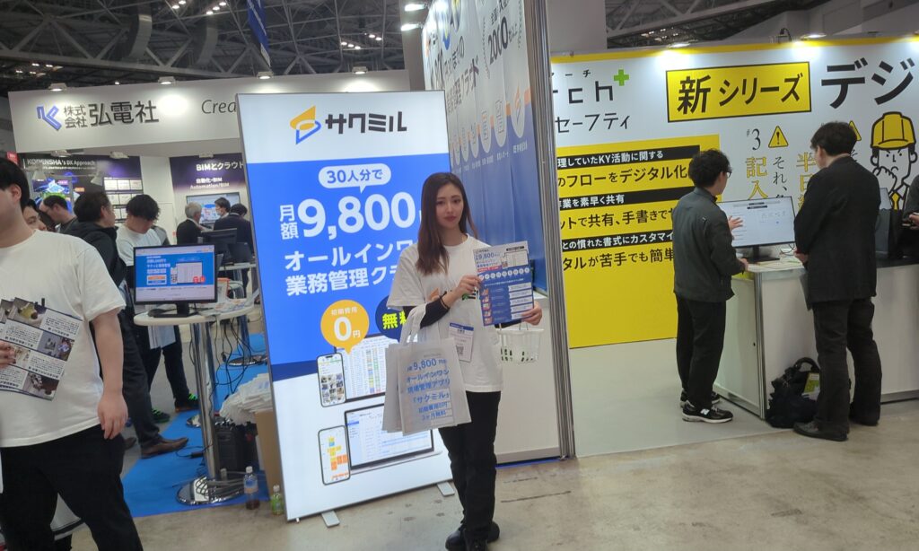 今回のサクミル様も、こうした建設DXの波をとらえてブースを出展されていました。施工管理の現場が抱える「紙の書類が多すぎる」「情報共有に時間がかかる」といった課題に正面から向き合うサービスを展開しており、来場者の関心度が高いテーマとマッチしていた点がポイントです。